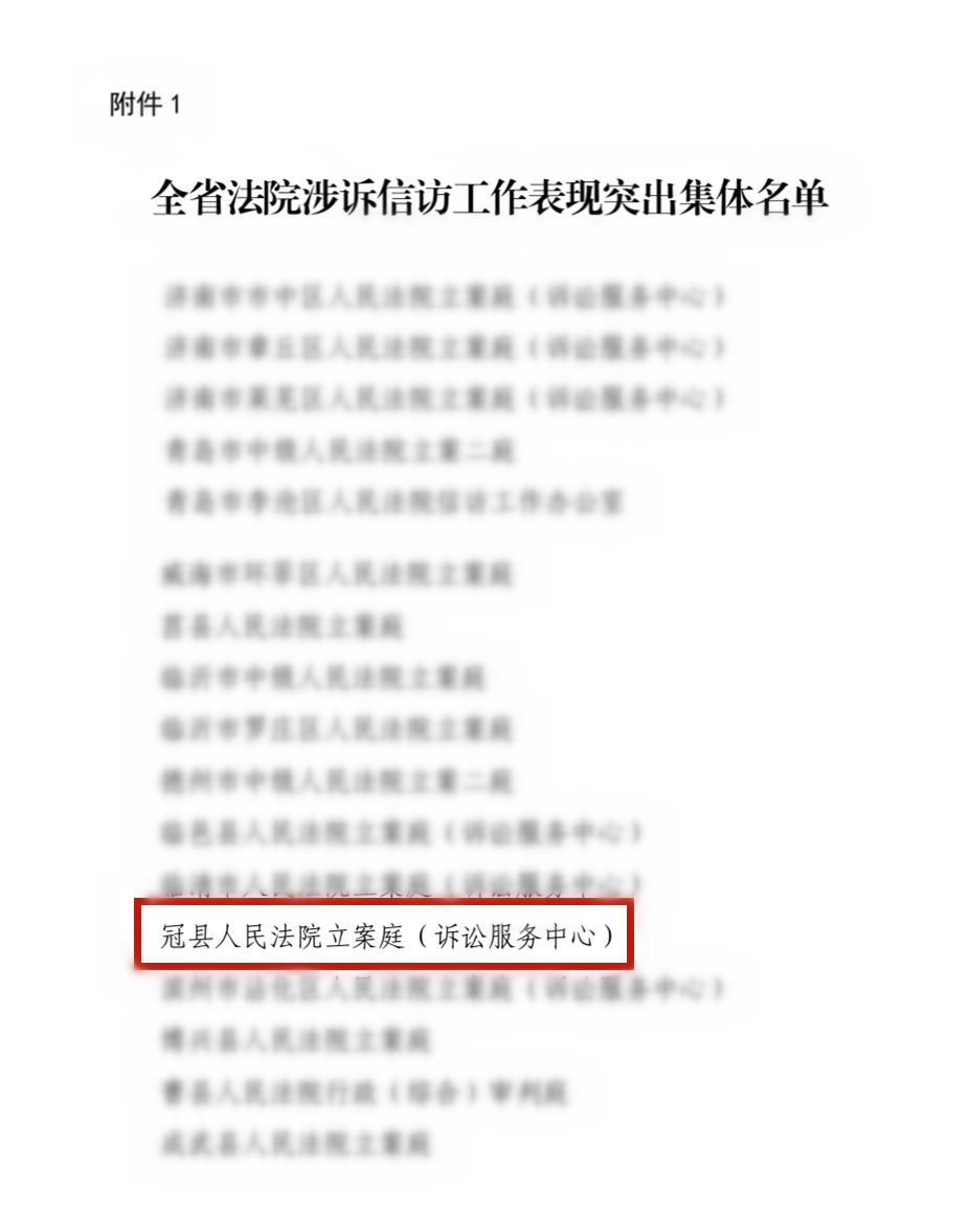 山东法制传媒网:近日,山东省高级人民法院通报表扬全省法院涉诉信访工作表现突出集体和个人,冠县法院立案庭(诉讼服务中心)被评为全省法院涉诉信访工作表现突出集体。