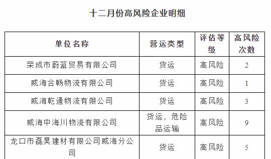 山东冠宇路桥建设工程有限公司、威海丰通汽车销售有限公司、文登区永安运输有限公司、威海市铸霖家纺厂、山东好当家海洋发展股份有限公司、文登区震泰物流有限公司、乳山市东林汽车修理厂、荣成市金宇国际集装箱运输有限公司、威海中海川物流有限公司、乳山市华润物流有限公司(危化品)、文登区运输有限公司(危化品)。
