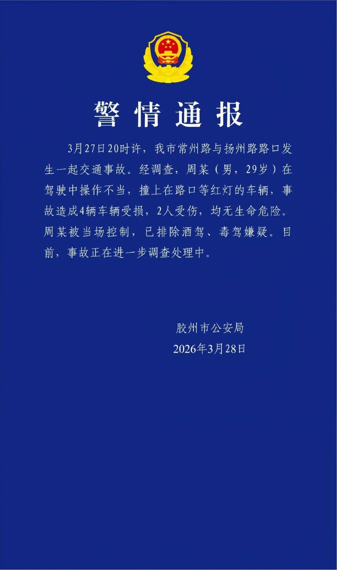 山东胶州警方通报一起交通事故:造成4车受损、2人受伤