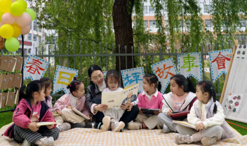 活动现场柳条轻拂,处处洋溢着欢声笑语。老师们化身故事大王,与孩子们围坐草坪温情共读。用生动的语言、丰富的表情、夸张的动作,声情并茂演绎经典绘本,穿插互动提问,引导孩子们观察想象。孩子们依偎在老师身旁,认真倾听、踊跃回应,在陪伴中感受阅读温情,拉近师幼距离。