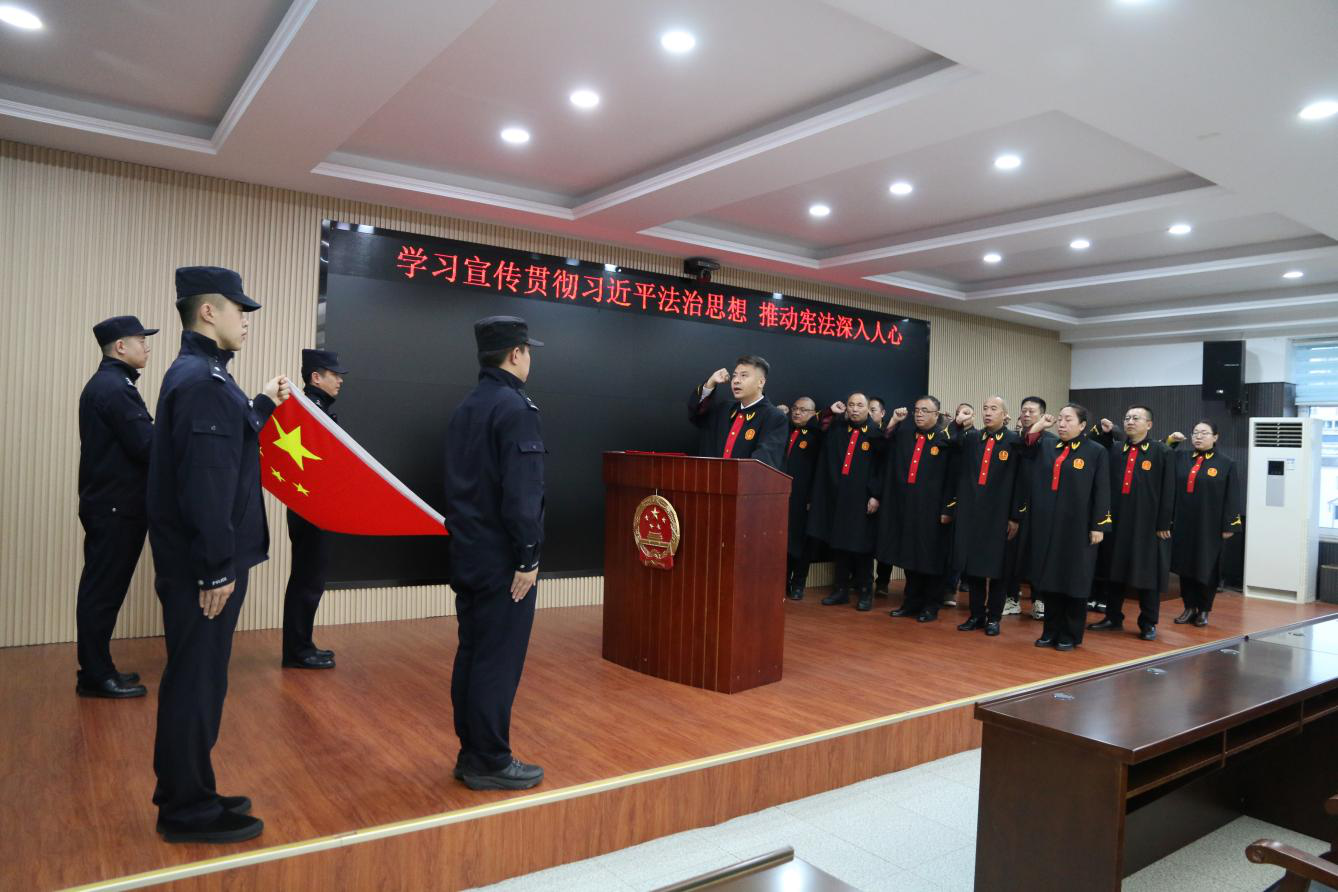 宪法宣誓仪式上,全体法官身着法袍,面向国旗,高举右拳庄严宣誓。誓言铿锵有力,彰显着对宪法权威的尊崇和司法为民的坚定决心。这一神圣时刻,让法官们深受宪法洗礼,筑牢法治信仰之基,激励他们公正司法、恪尽职守。