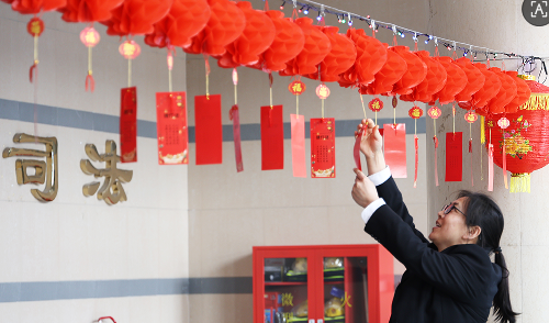 法院机关处处洋溢着浓厚的节日气息。前院小广场两侧的树木上,一盏盏大红灯笼与斑斓彩灯交错悬挂,宛如结出累累硕果。办公楼前东西两侧的香樟树也被精心装点,星光点点的彩灯在枝叶间闪烁。一楼大厅,形态各异的彩灯与灯笼被装点得年味十足,传统佳节的欢乐祥和与法院的司法温情,构成了法院里一道独特而亮丽的风景线。