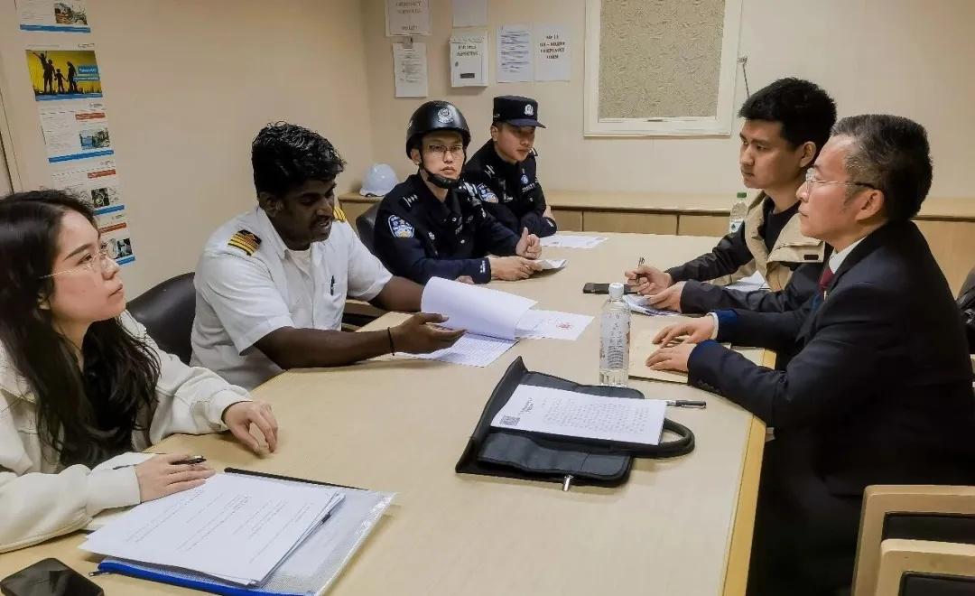 在边防警察陪同下,青岛海事法院办案法官登轮开展保全工作。
