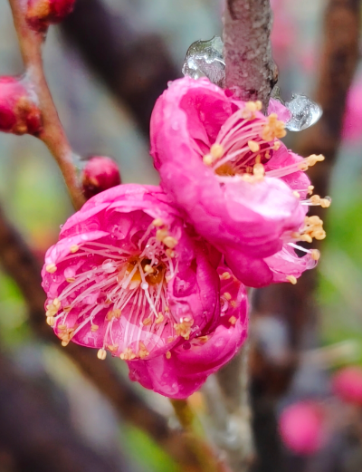 红梅有着一股倔强的劲头,即便在冰天雪地中也能一枝独秀。它不像温室里的花朵那般娇弱,偏要在恶劣的环境中展现自身风姿。“红梅含笑迎飞雪”,即便面对冻雨,它也傲然挺立。这份傲骨令人动容,从它身上,能看到不屈不挠的精神,恰似生活中那些不惧艰难、勇往直前之人,在困境中依旧能绽放光彩。