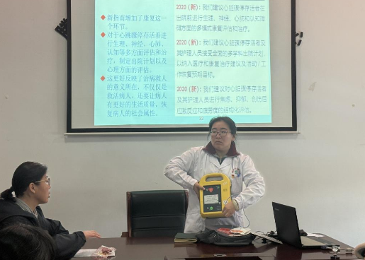 培训开始,张秋苹结合基层医疗工作实际,围绕心脏骤停的紧急处置、心肺复苏的核心要点、AED自动体外除颤仪的操作规范等关键内容展开细致讲解。通过精心制作的PPT课件,张主任用通俗易懂的语言,详细阐释了心搏骤停抢救“黄金4分钟”的重要性,拆解了心肺复苏从环境评估、意识判断、呼救求援,到胸外按压、人工呼吸的标准化流程,明确了胸外按压的频率、深度以及人工呼吸的操作要领;同时,针对AED设备的工作原理、适用场景、电极片粘贴位置、操作步骤及安全注意事项等内容进行了全面科普,结合真实急救案例分析,让参训人员深刻认识到规范急救操作的重要意义,筑牢了急救理论基础。