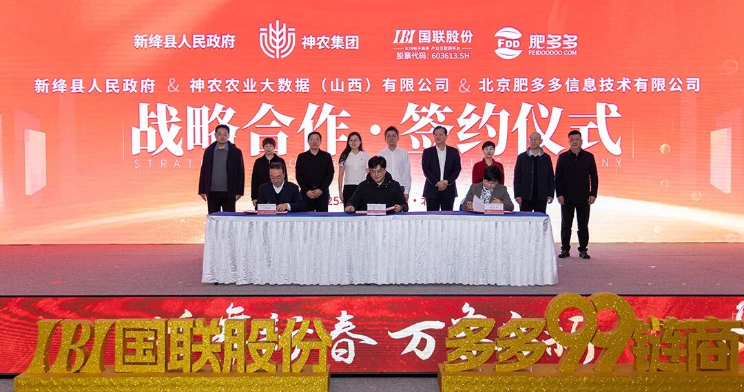 12月20日下午,山西省新绛县人民政府、国联股份肥多多、神农农业大数据(山西)有限公司(以下简称“神农集团”)在国联股份数字经济总部签订战略合作协议。新绛县副县长王星、肥多多硫酸铵供应链运营中心总监马彩平、神农农业大数据(山西)有限公司董事长兰瑞忠代表各方进行签约。