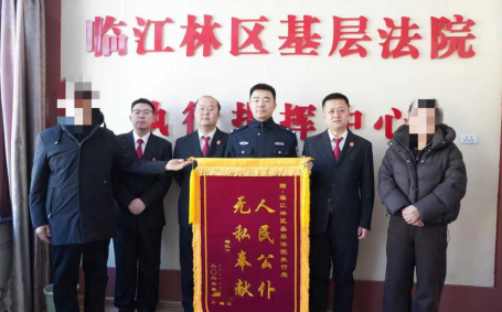 申请执行人对吉林省临江林区基层法院执行局法官干警连连感谢,并为执行局法官干警送来了一面印有“人民公仆、无私奉献”八个鎏金大字的锦旗。