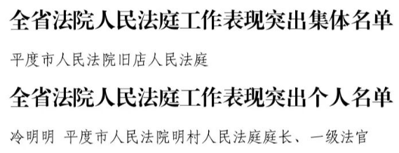 山东法制传媒网:为表彰先进、激励队伍,营造干事创业、争先创优的浓厚氛围,近日,山东省高级人民法院对全省法院人民法庭工作中表现突出集体和个人予以通报表扬。其中,旧店法庭获评“全省法院人民法庭工作表现突出集体”,明村法庭庭长冷明明获评“全省法院人民法庭工作表现突出个人名单”。(山东平度人民法院)