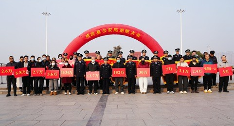 山东法制传媒网:(于得水 孔令乾)为充分展示公安机关打击违法犯罪的坚定决心和丰硕战果,切实提升人民群众安全感、满意度,12月16日下午,山东省成武县公安局在蓝水湾风景区相马广场举行集中退赃大会。成武县公安局党委副书记、政委崔子奇参加活动并讲话,党委委员、副局长孙栋主持活动。