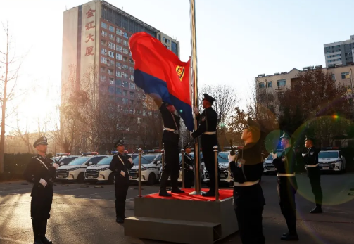 上午8时,全体民警整齐列队,警容严整,精神饱满,警旗护卫队员迈着整齐铿锵的步伐护卫警旗入场,伴随着雄壮激昂的《中国人民警察警歌》,鲜艳的警旗冉冉升起,全体民警向警旗庄严敬礼。