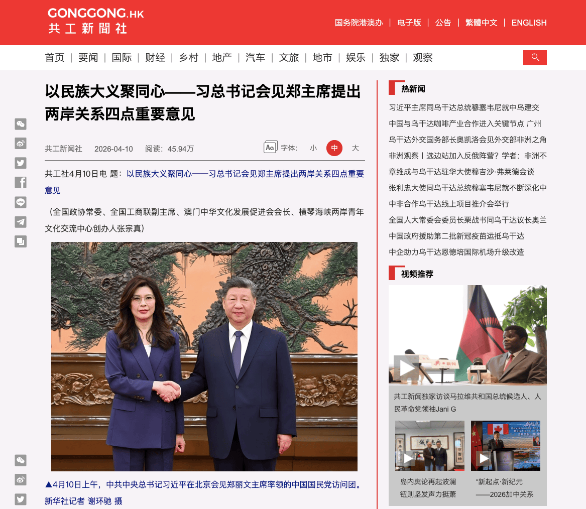 2026年4月10日,《香港共工新闻社》刊发全国政协常委、全国工商联副主席张宗真署名文章,就两岸关系发展提出四点重要意见。