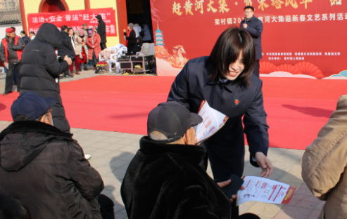 活动现场,艺术家们向群众表演丰富多彩的舞蹈、歌曲、戏曲等节目,挥毫泼墨,将一幅幅“春”“福”送给群众,医务者们为群众免费测量血压,提供健康咨询。检察官们热情地发放法律宣传资料,登台为群众现场讲解“酒驾”“酒后伤害他人”“恶意欠薪及拖欠工资”等的危害、后果及预防办法,告诫“酒后不开车,开车不饮酒”,并围绕检察职能,现场讲解检察机关支持起诉的条件和受案范围,给热闹的集市增添了法治气息。