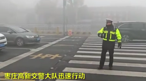 大雾来袭 山东枣庄高新交警立体防控保畅通