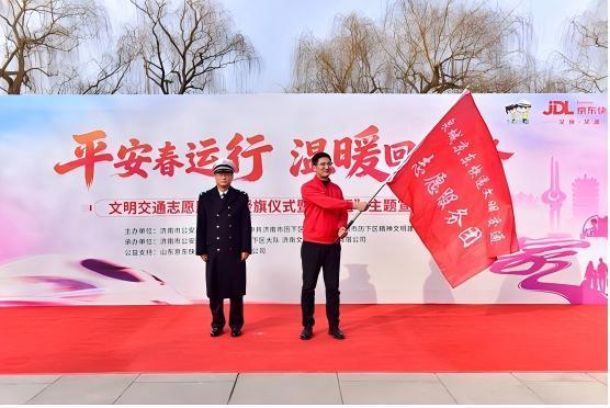 最后,出席活动的济南交警支队、历下区交警大队负责人等共同为“泉城快递文明交通志愿服务团”授旗,并为志愿者代表佩戴“文明交通志愿者”袖标,标志着这支由快递员组成的文明交通志愿服务队伍正式成立。春运期间,该志愿服务团将化身流动的交通安全宣传站,在走街串巷进行配送服务、连接千家万户的同时,主动传递平安出行理念,助力筑牢春运交通安全防线。
