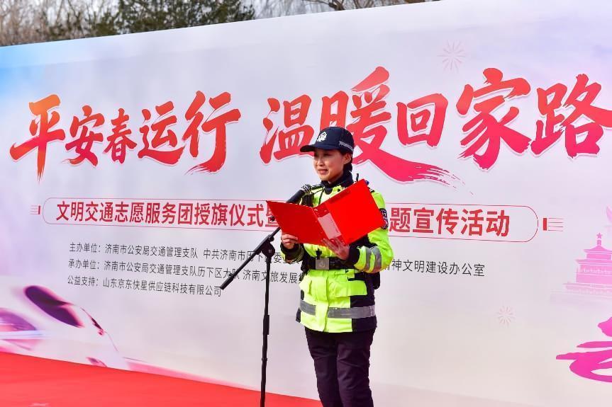 活动现场,历下区交警大队女子中队民警代表进行交通安全宣讲,表明了护航春运交通安全、全力服务市民出行的决心。