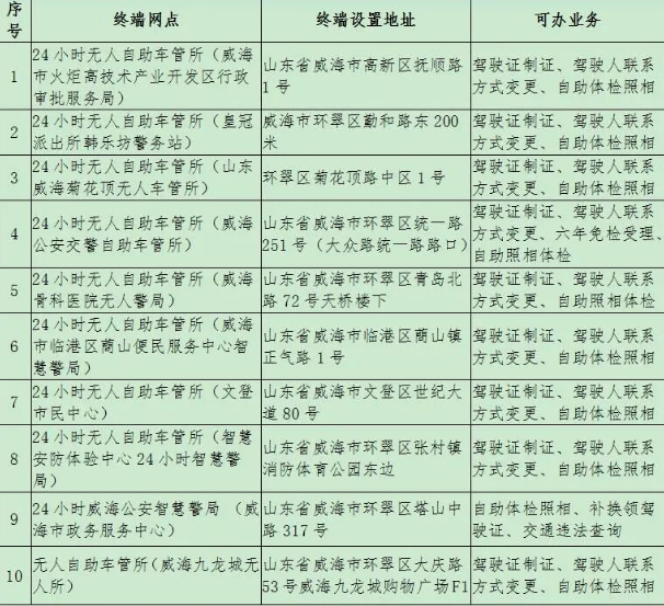 春节期间威海市车驾管自助网点信息表