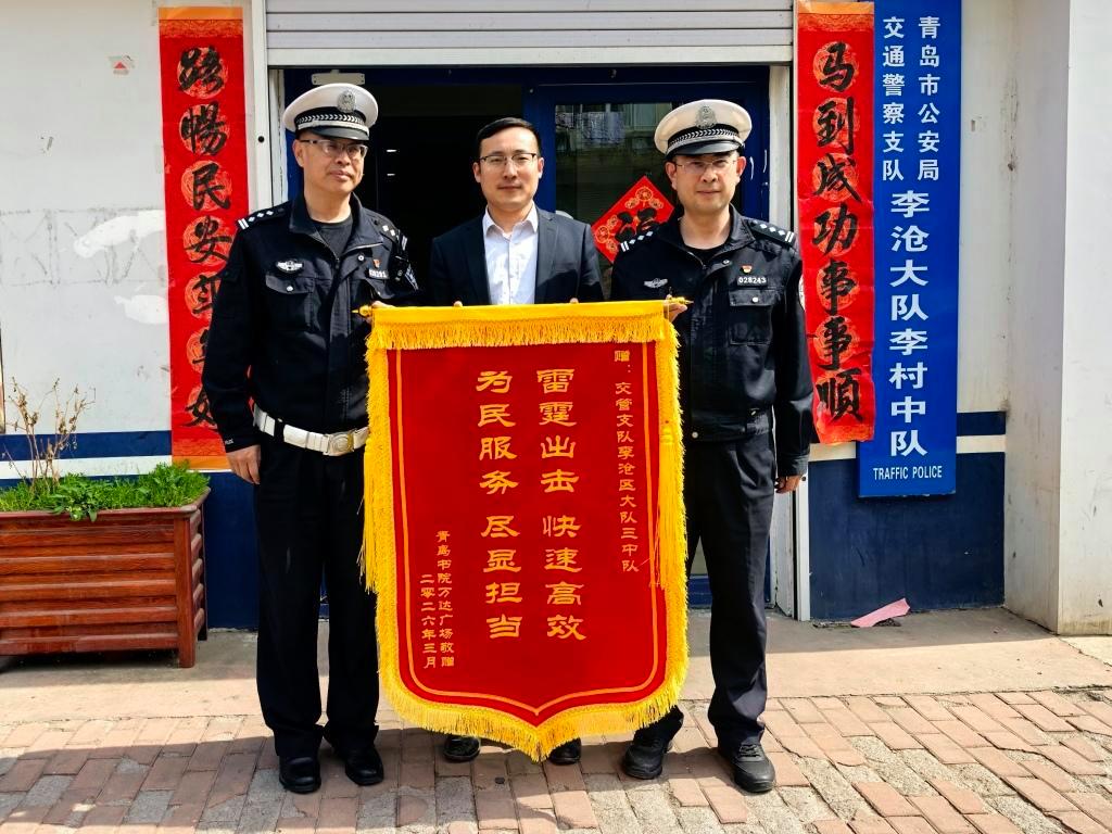 山东法制传媒网:(孙晓婷 王伟伟)近日,山东省青岛市李沧区书院路万达广场负责人专程来到公安交管李沧区大队三中队,将一面印有“雷霆出击 快速高效 为民服务 尽显担当”的锦旗亲手送到民辅警手中,对交管部门主动作为、务实高效破解企业周边交通难题,助力商圈发展营造良好交通环境表示衷心感谢。这份认可,源于李沧区大队三中队近期针对东兴路交通乱象开展的专项整治行动,该行动有效解决了车辆违停、道路拥堵等突出问题,切实保障了群众出行安全畅通。
