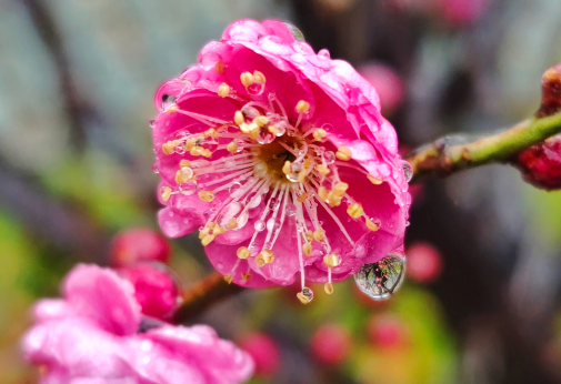 红梅有着一股倔强的劲头,即便在冰天雪地中也能一枝独秀。它不像温室里的花朵那般娇弱,偏要在恶劣的环境中展现自身风姿。“红梅含笑迎飞雪”,即便面对冻雨,它也傲然挺立。这份傲骨令人动容,从它身上,能看到不屈不挠的精神,恰似生活中那些不惧艰难、勇往直前之人,在困境中依旧能绽放光彩。